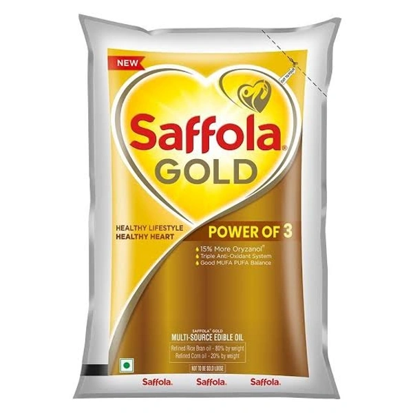 Saffola Gold Refined Cooking Oil - Blend Of Rice Bran & Corn Oil, Multi-Source Edible, 1 L Pouch